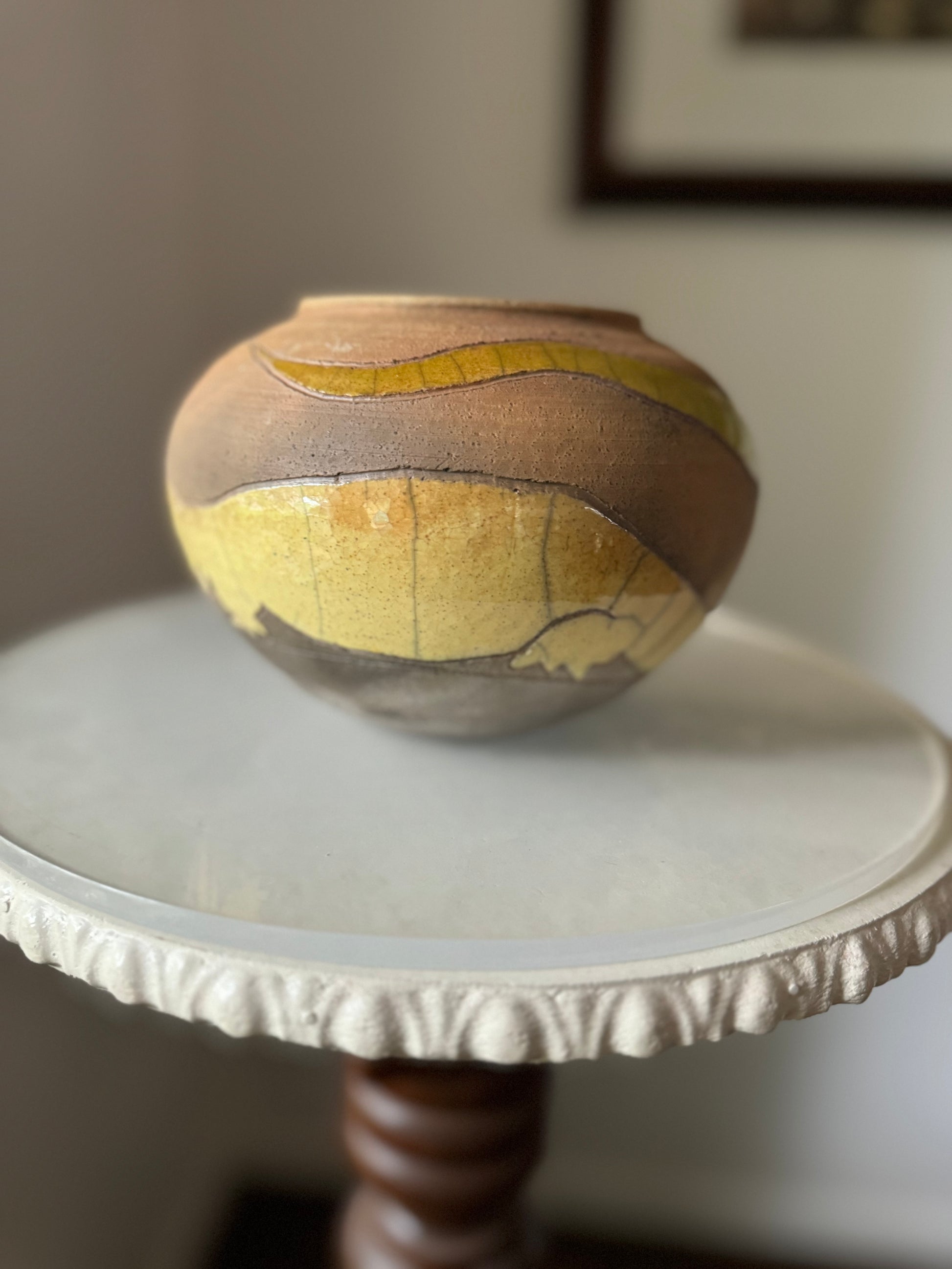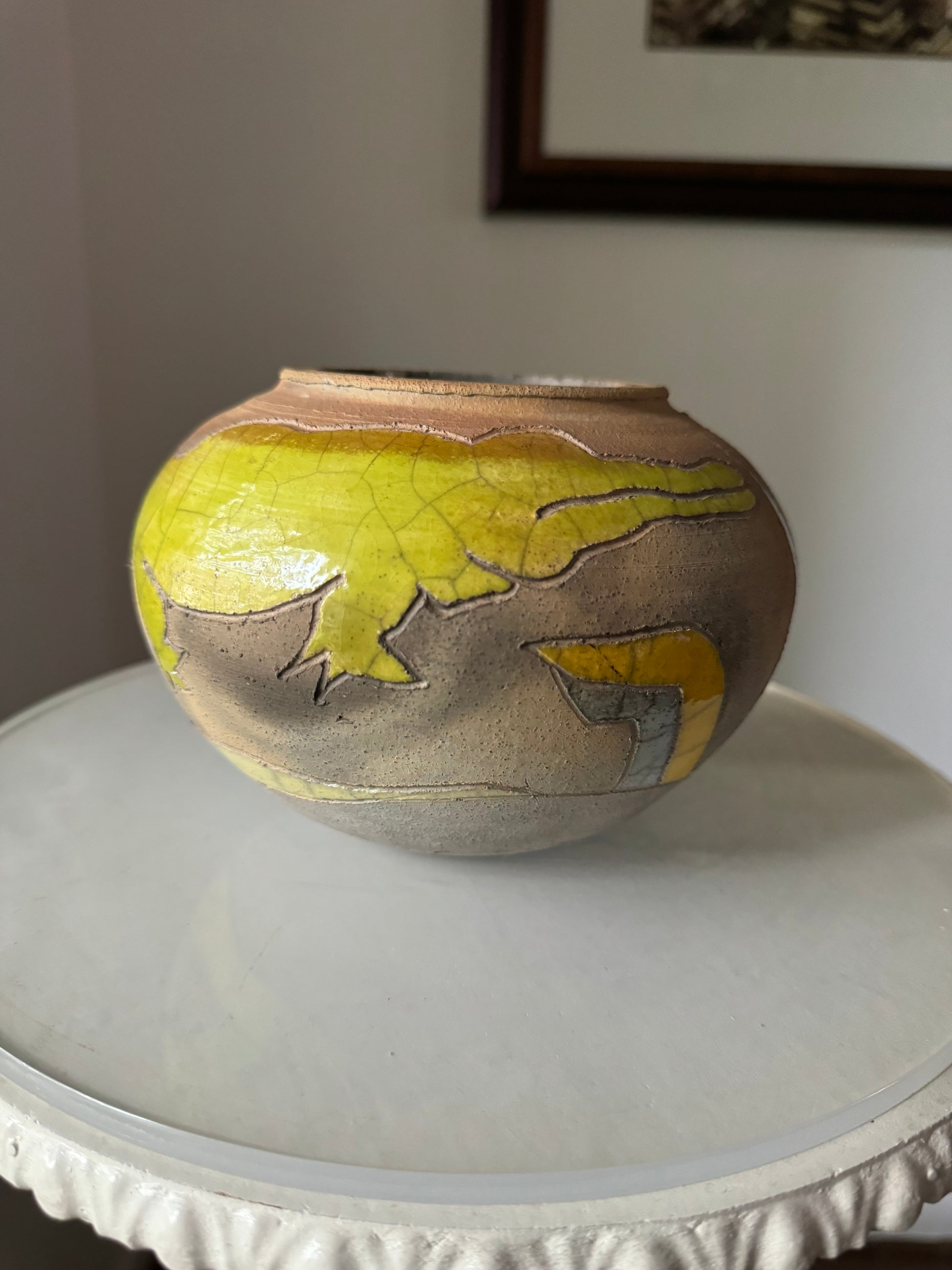 This Vintage Randy Brodnax Crocodile Vase is a captivating piece of art that reflects the unique creativity and skill of its maker. Originally from Louisiana and now based in Dallas, TX, Randy Brodnax is a renowned ceramic artist specializing in Raku, a traditional Japanese pottery technique. His work is deeply inspired by the natural world, drawing from a fantasy realm filled with imaginative creatures, particularly those from nature, such as animals and fish.